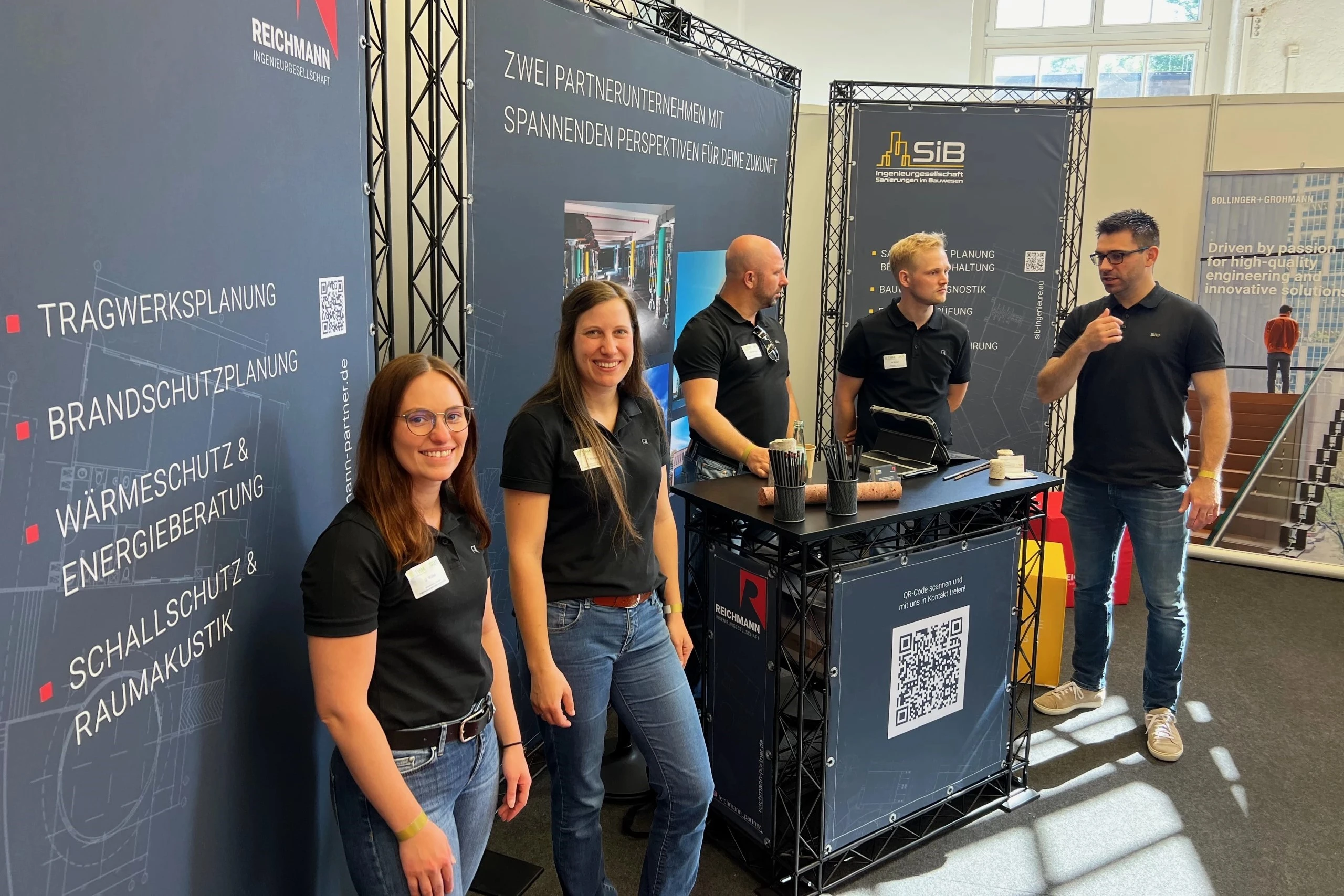 Reichmann + Partner bietet auf einem gemeinsamen Messestand mit der SiB Ingenieurgesellschaft interessierten Studenten einen interessanten Einblick in den Berufsalltag des Bauingenieurs in den Bereichen Tragwerksplanung, Brandschutz, Bauphysik und Betoninstandsetzung.