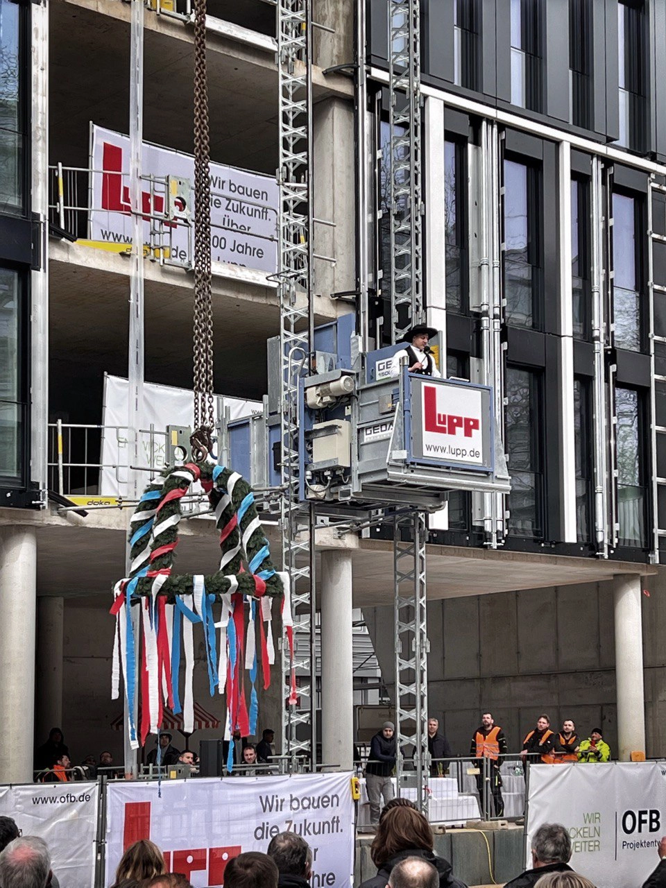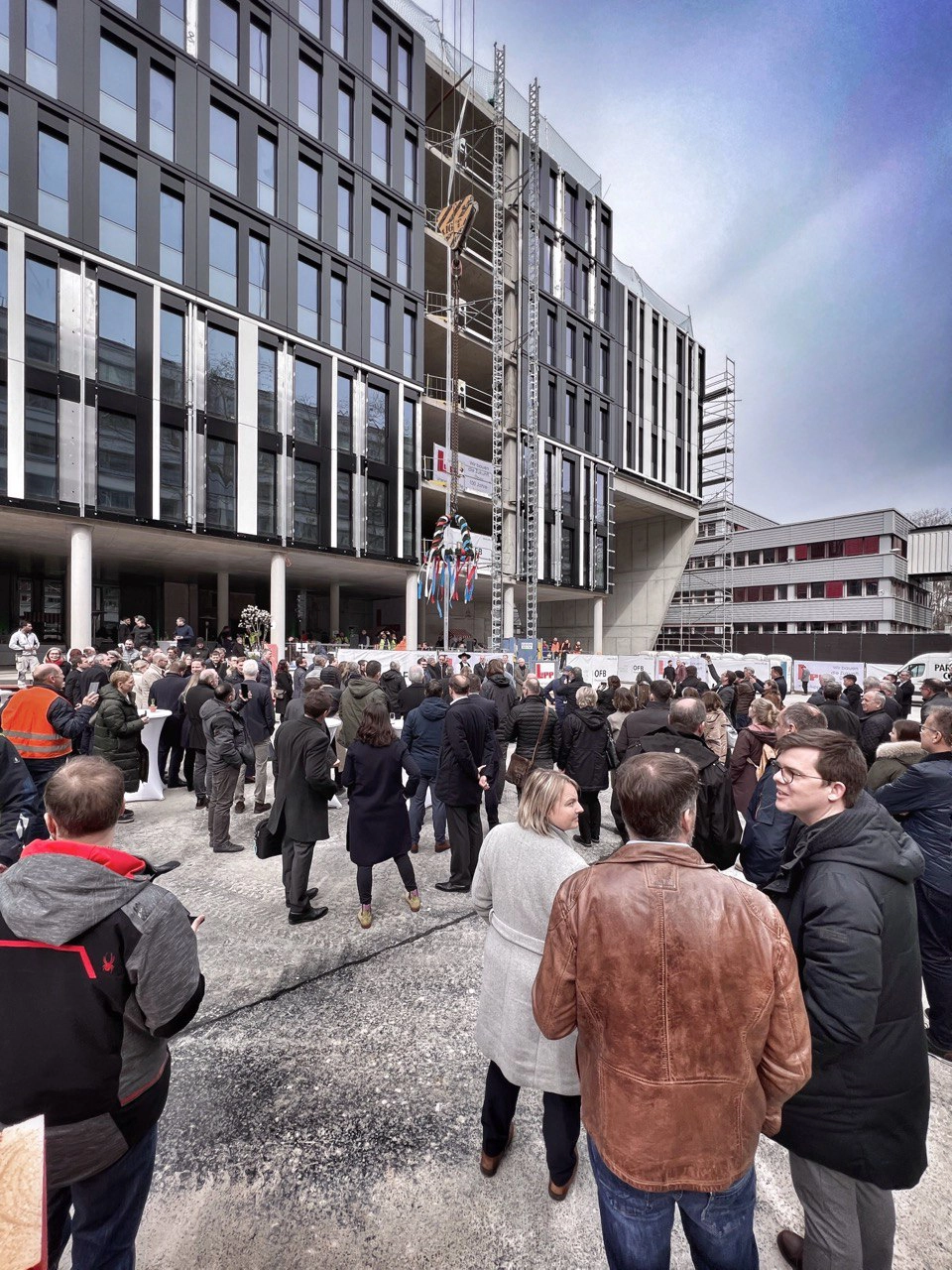 Acht Monate nach der Grundsteinlegung fand am 21.3.23 das Richtfest des Oak House, Wiesbadens neuem Behördenzentrum am Schiersteiner Berg, statt. Die OFB Projektentwicklung GmbH und der Generalübernehmer Adolf Lupp GmbH feierten die Fertigstellung gemeinsam mit 150 Gästen und 200 beteiligten Handwerkern und Planern.
