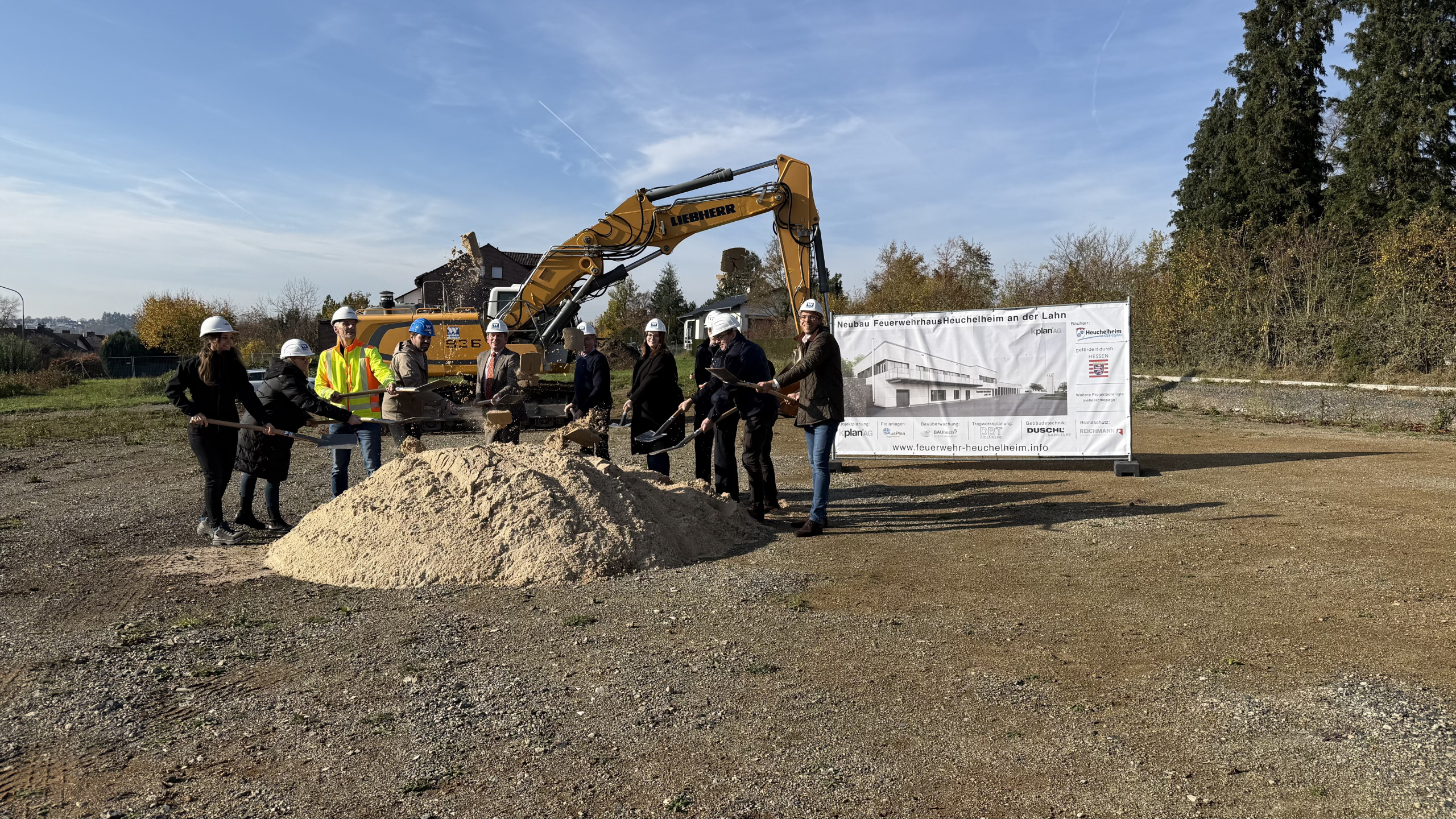 Am 6. November fand der Spatenstich für das Großprojekt Feuerwehrstützpunkt Heuchelheim statt. Auf dem rund 6400 qm großen Gelände entsteht für voraussichtlich 15 Millionen Euro ein 130 m langes zweigeschossiges Gebäude mit 14 Hallen für Fahrzeuge von Feuerwehr und Material für Wehr und Katastrophenschutz plus Waschhalle. Hinzu kommen eine Einsatzzentrale, Schulungs- und Besprechungsräume, ein Übungsturm und nicht zuletzt ein „open work space“.